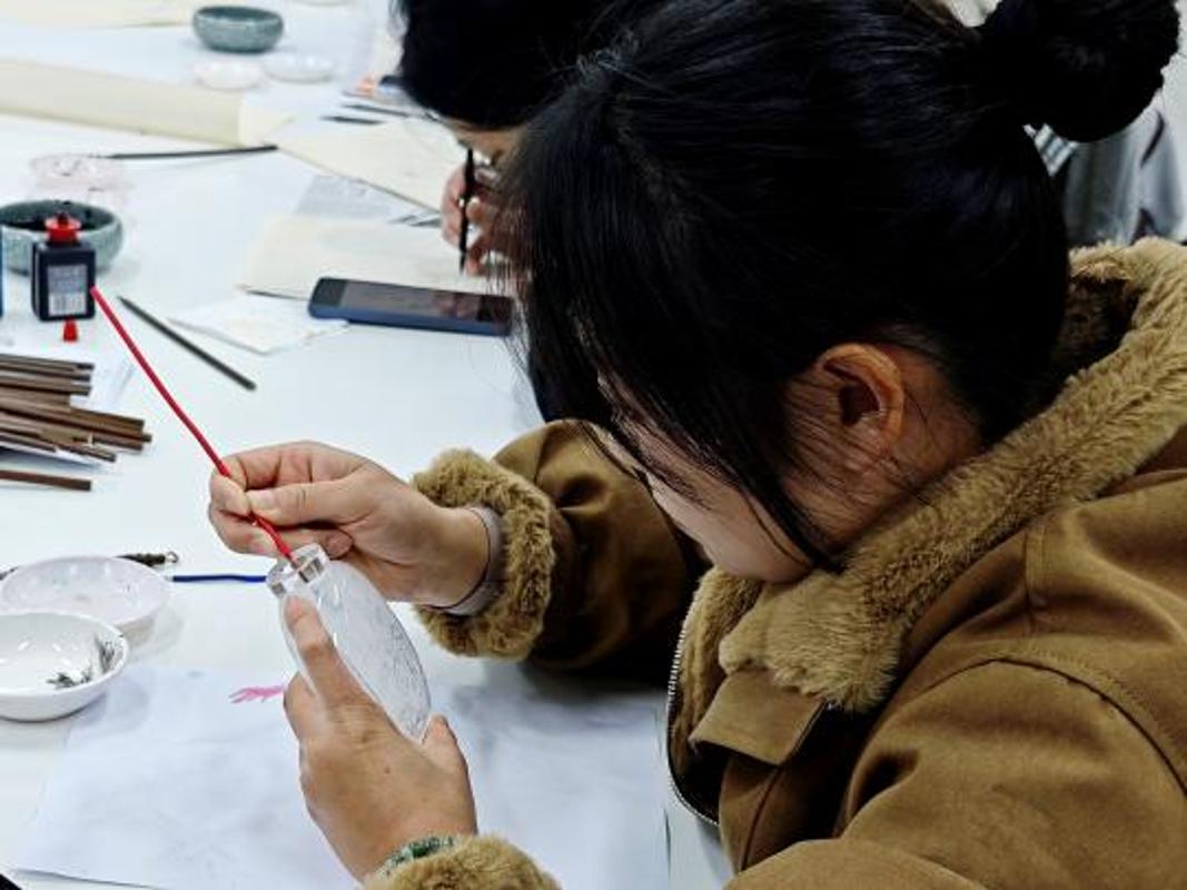 “手腕要稳,呼吸要匀,心要静。”孙鸿雁老师穿梭于学员之间,逐一进行手型指导。初次在瓶内反向作画,笔尖仿佛不听使唤,但这正是内画修炼的必经之路。教室里安静无声,只有细微的笔尖与壶壁摩擦的沙沙声,每位学员都全神贯注,在与自己的耐心和掌控力对话。