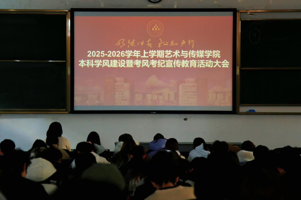 为进一步强化学生诚信意识,端正学习态度,营造风清气正的考试环境,艺术与传媒学院于12月18日15:30,在中心教学楼100教室召开了2025-2026学年上学期艺术与传媒学院本科学风建设暨考风考纪宣传教育大会。学院党委副书记余红珍、副院长钟晖、辅导员谢雅妮、优秀推免生代表及2025级全体本科生参加了此次大会。