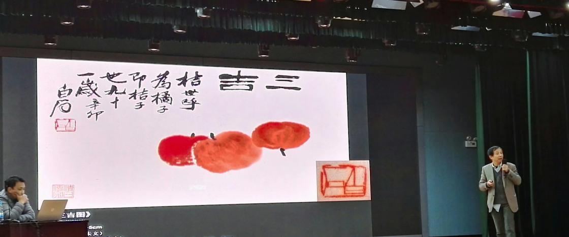 随后,胡西林老师对齐白石老先生的书画作品展开鉴赏。以《三吉图》为例,此作横竖构图和谐交融,堪称一绝。不得不说的是此件艺术品中的印章,可谓小中见大,为作品的韵味再添一笔。如今呈现在大家面前的《枫叶草虫图》,从完成到今天的展出,已是历经磨难(裁剪,修复,添章),也正是这些经历成就了这一代名画的传奇故事。
