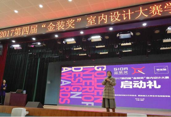 云南省室内设计行业协会会长罗正将先生在致辞中,向大家介绍了云南省室内设计行业协会的概况及“云南设计·名师讲坛”系列活动深入校园的意义,并详尽的介绍了2017第四届“金装奖”室内设计大赛(学生组)的赛事宗旨及流程。他说:“‘金装奖’室内设计大赛是云南省室内设计行业协会倾力打造的面向全云南省设计师,秉承公平、公正、公开、公益的赛事宗旨。往届赛事收到稿件数百套,并在国内国际专家评委的评审下每届角逐出64套获奖作品,且结集成册,录入《云南装饰设计年鉴》,成为云南设计界的一张‘名片’。此次将学生群体独立设组,旨在提高同学们的参赛热情,有效为同学们搭建起相互促进交流的平台。”最后,罗会长强调,参赛只是手段而非目的,真正的目的是让同学们在参赛中不断学习,收获成长。